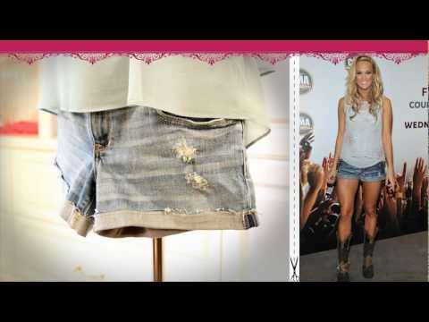 Carrie Underwood pairs a sheer faded blue pastel blouse with some cut-off denim shorts. Need a good staple for summer? These shorts are your answer!