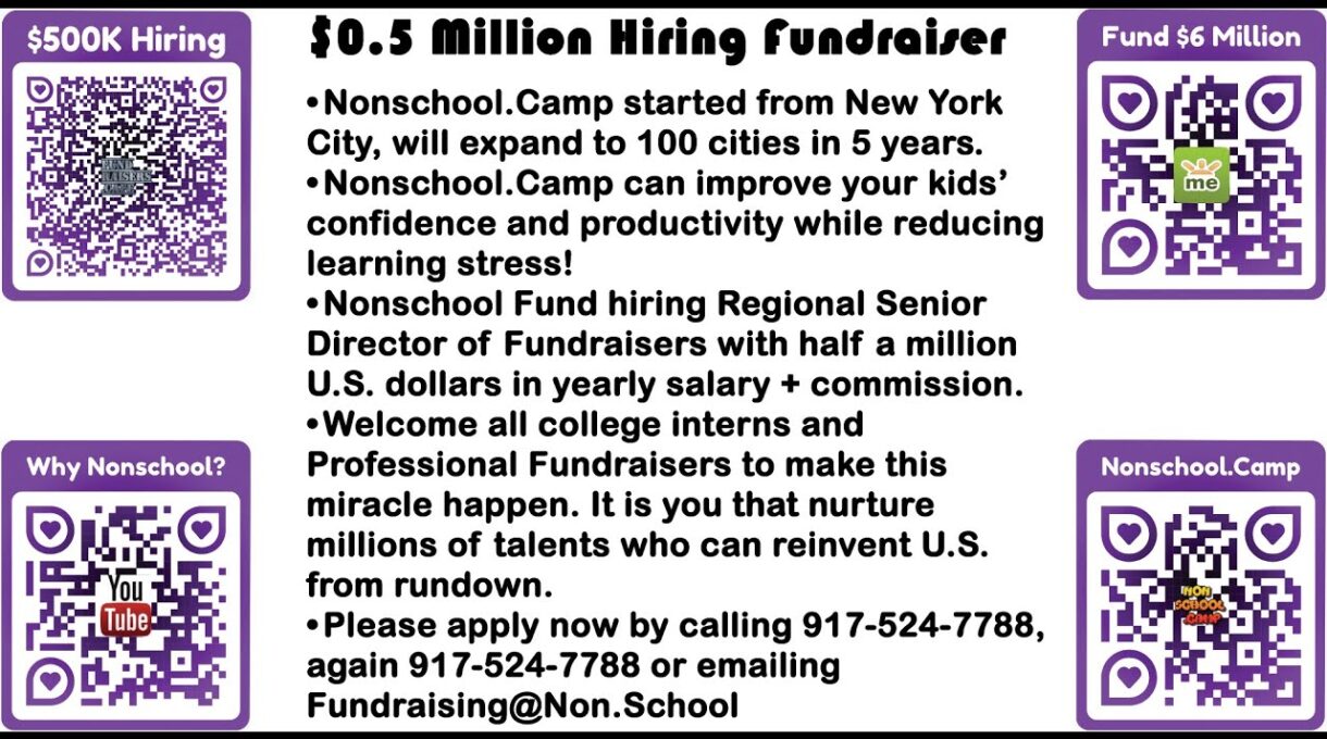 • Nonschool.camp’s mission is equivalent to expanding #1 college by 100 times bigger in size physically, bringing education to 2.0 version.